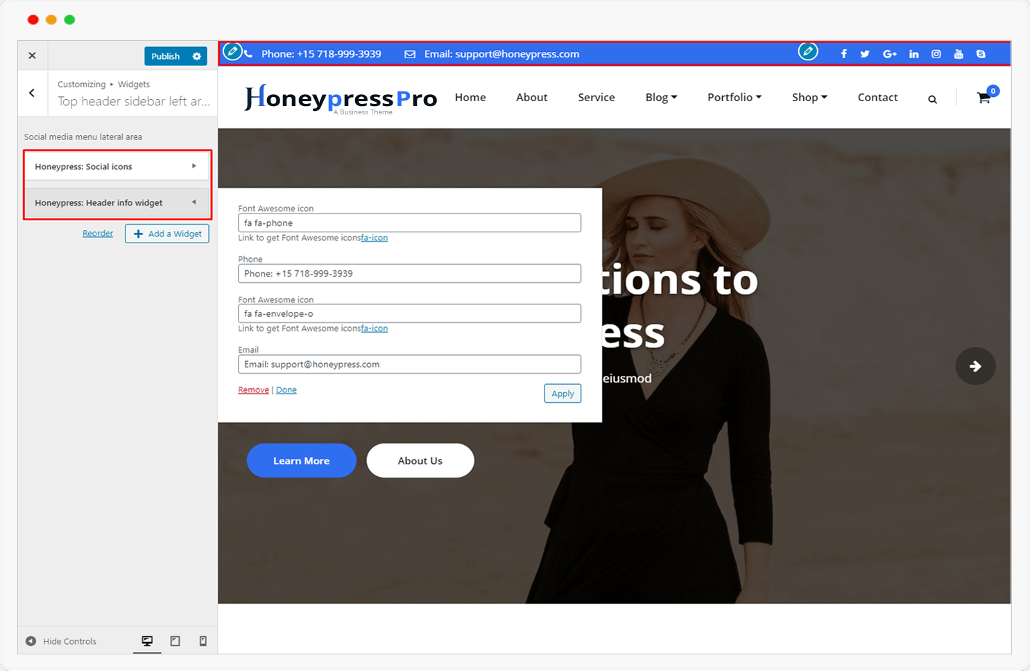 The theme offers its own custom widgets like Header Info Widget and Social Icons Widget.