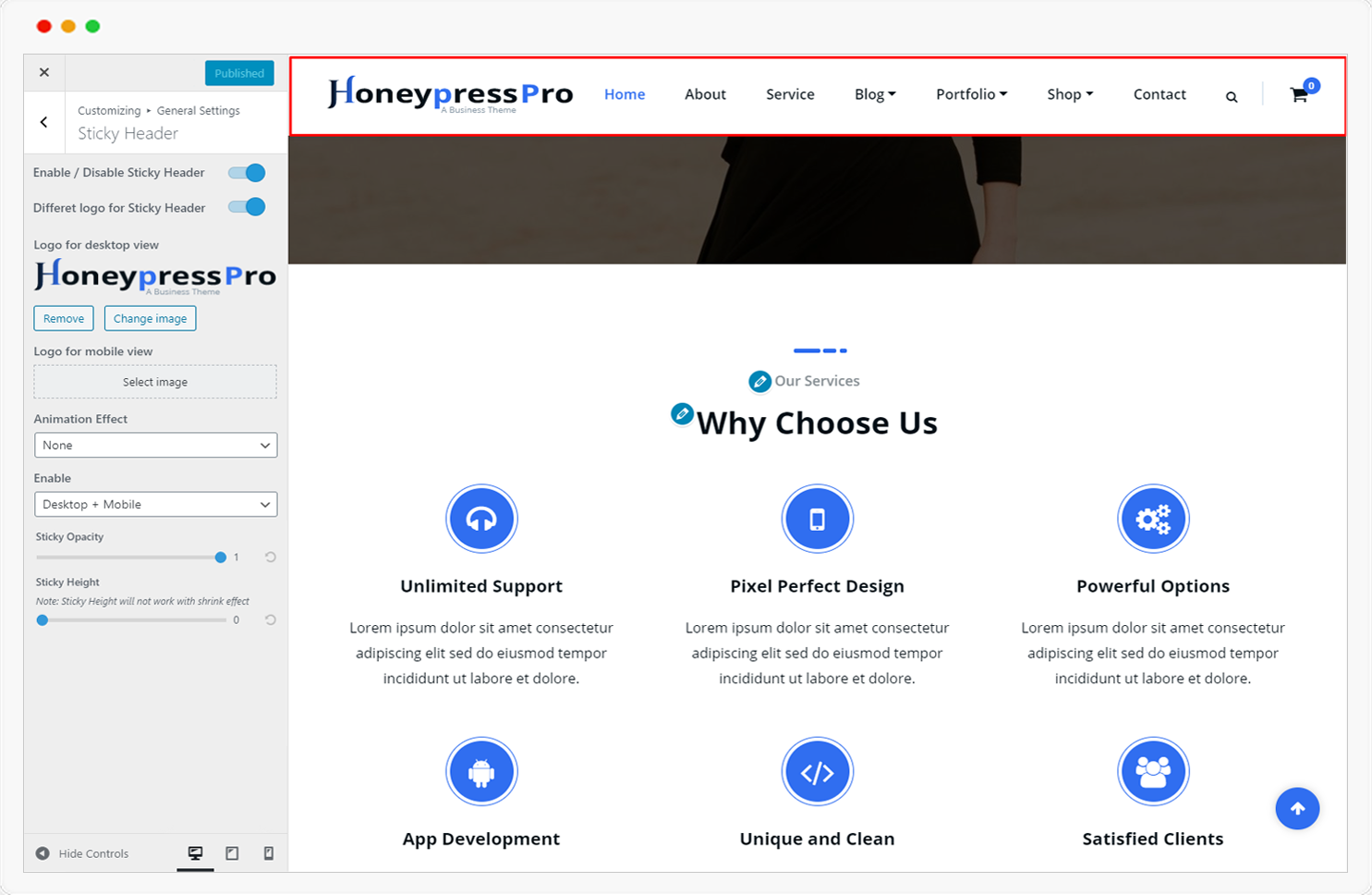 Our theme comes with a unique setting for a sticky header. You are able to set different logos for different views like desktop and mobile. Also able to choose either you want to use a sticky header on desktop, mobile or both.